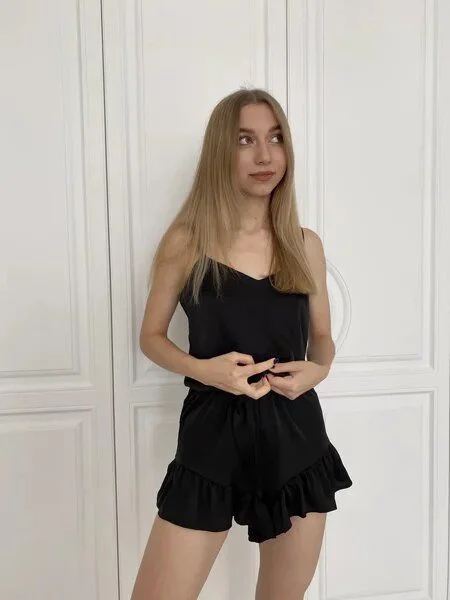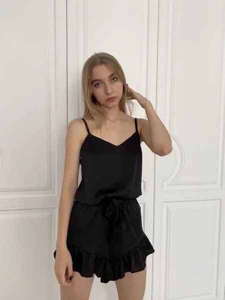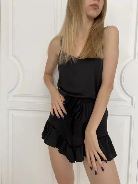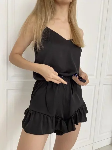 Пижама состоит из шорт на высокой посадке, украшенных рюшами и топа на тонких бретелях.