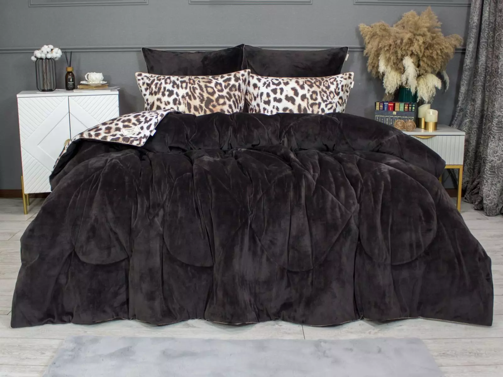 Особенность комплекта заключается в двустороннем одеяле, одна сторона выполнена из теплого мягкого, нежного велюра, а другая выполнена из нежнейшего 100% египетского хлопка, который отличается особой мягкостью и долговечностью. Главный плюс такого одеяло, что его можно использовать как покрывало. По краю изысканная золотая окантовка.