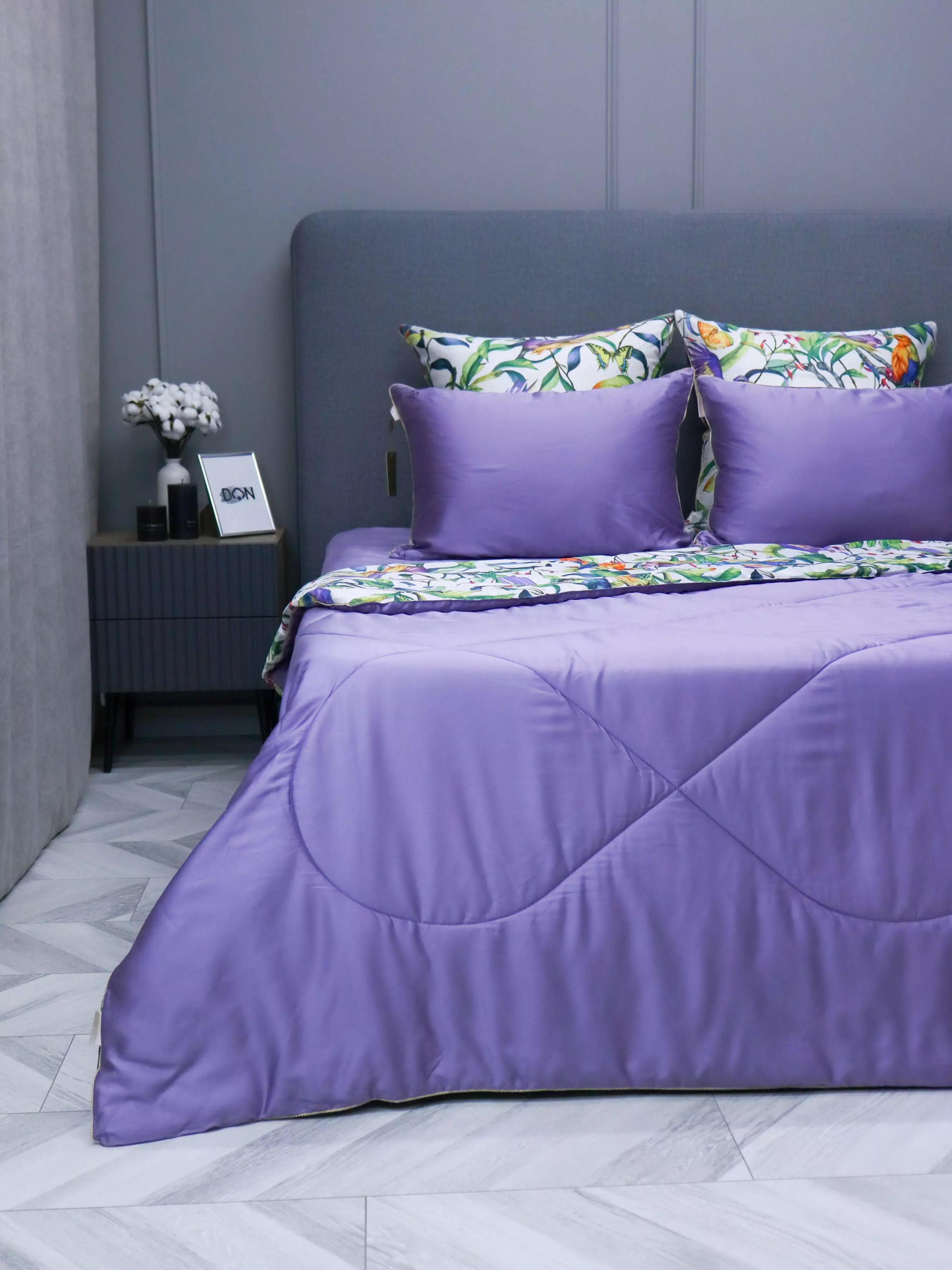 Двустороннее одеяло: одна сторона выполнена из египетского хлопка с цветочным принтом, другая — из однотонного тенселя. Одеяло обладает «дышащими», терморегулирующими свойствами и прекрасно выдерживает стирки. Витой кант и изысканная стёжка добавляют элегантности и завершённости дизайну.