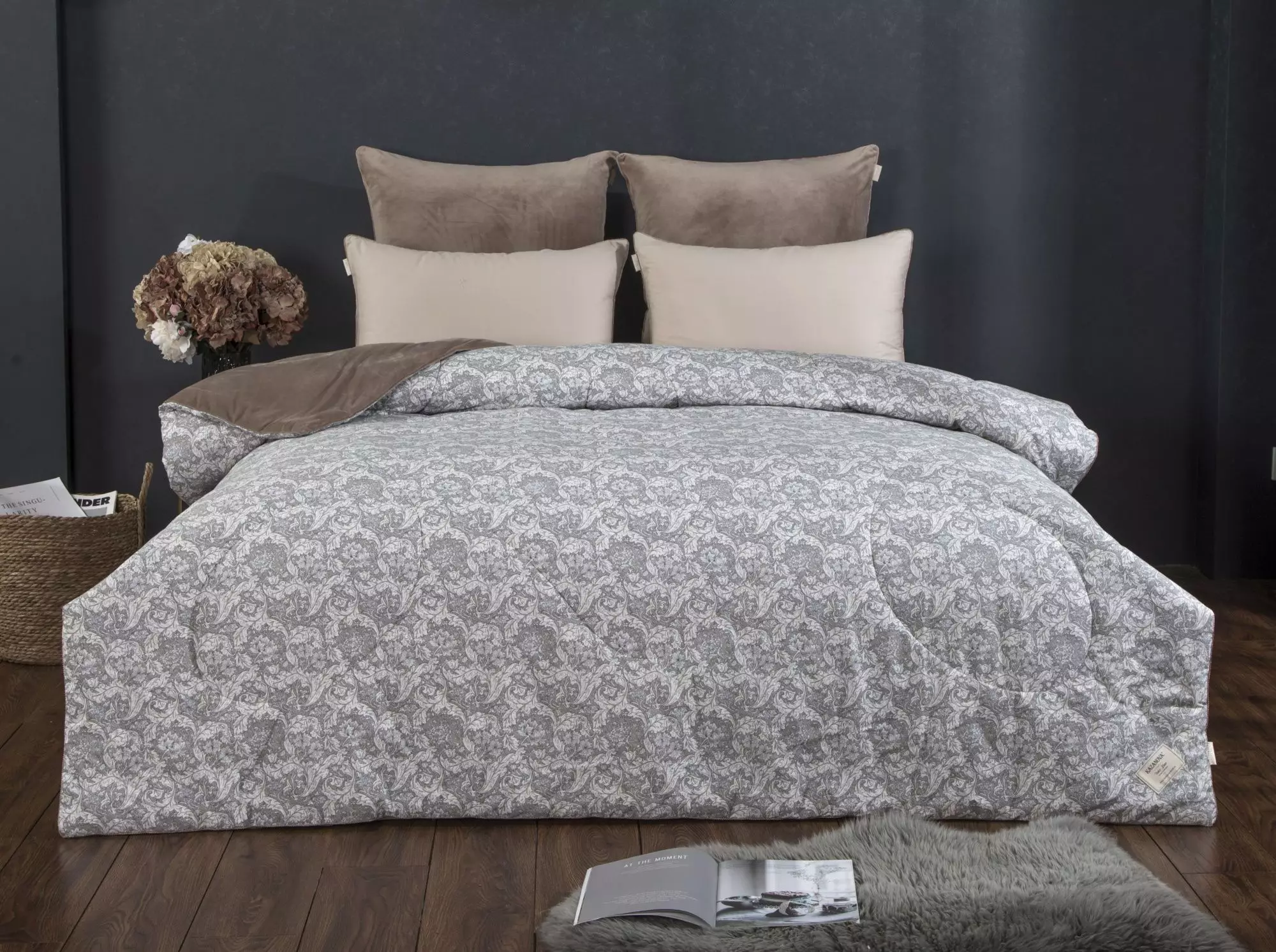 Двустороннее одеяло с оригинальной стёжкой и витым кантом по периметру. С одной стороны — прохладный сатин, с другой — мягкий велюр, идеально подходящий для сна под кондиционером или в прохладное время года.