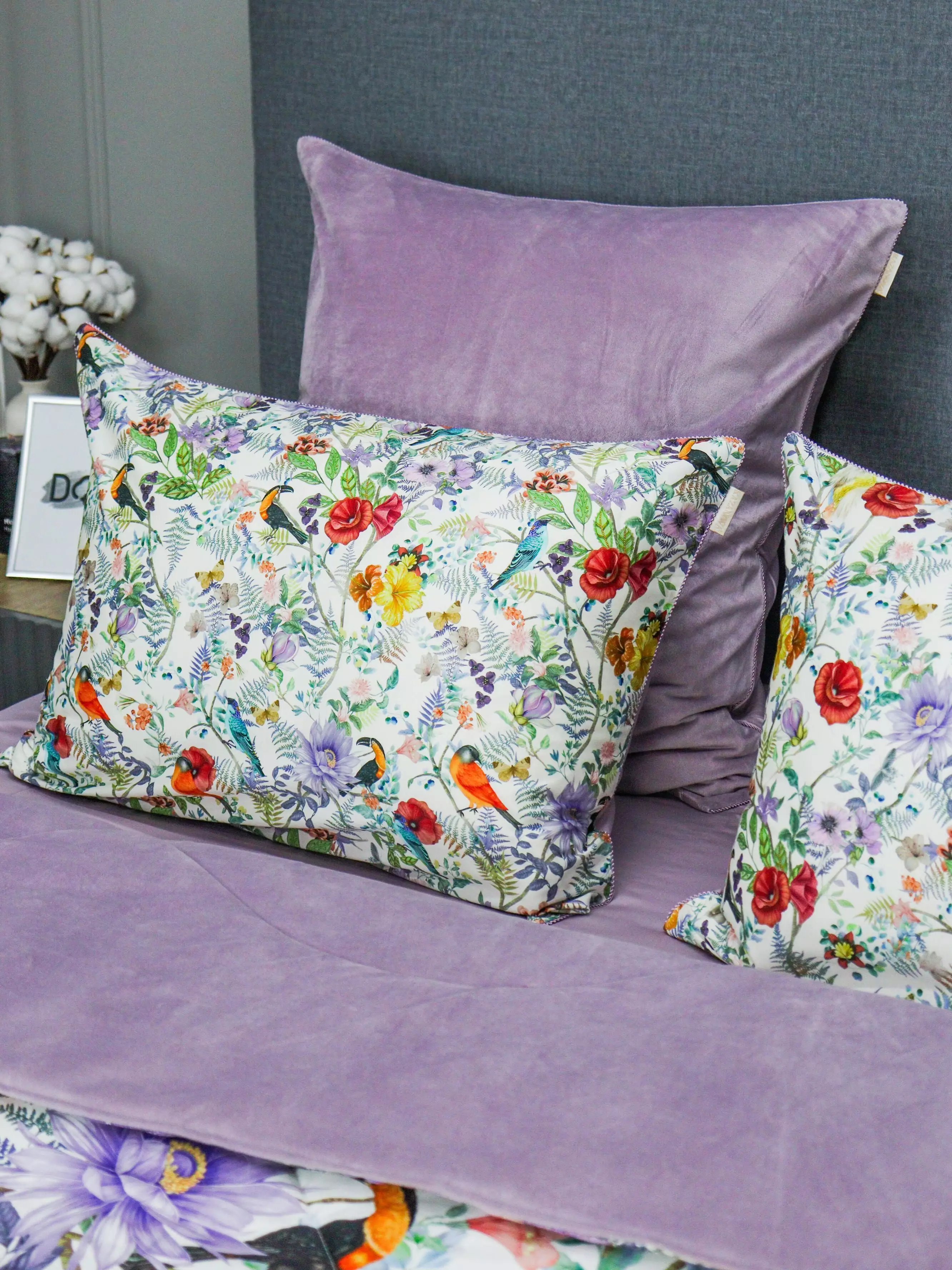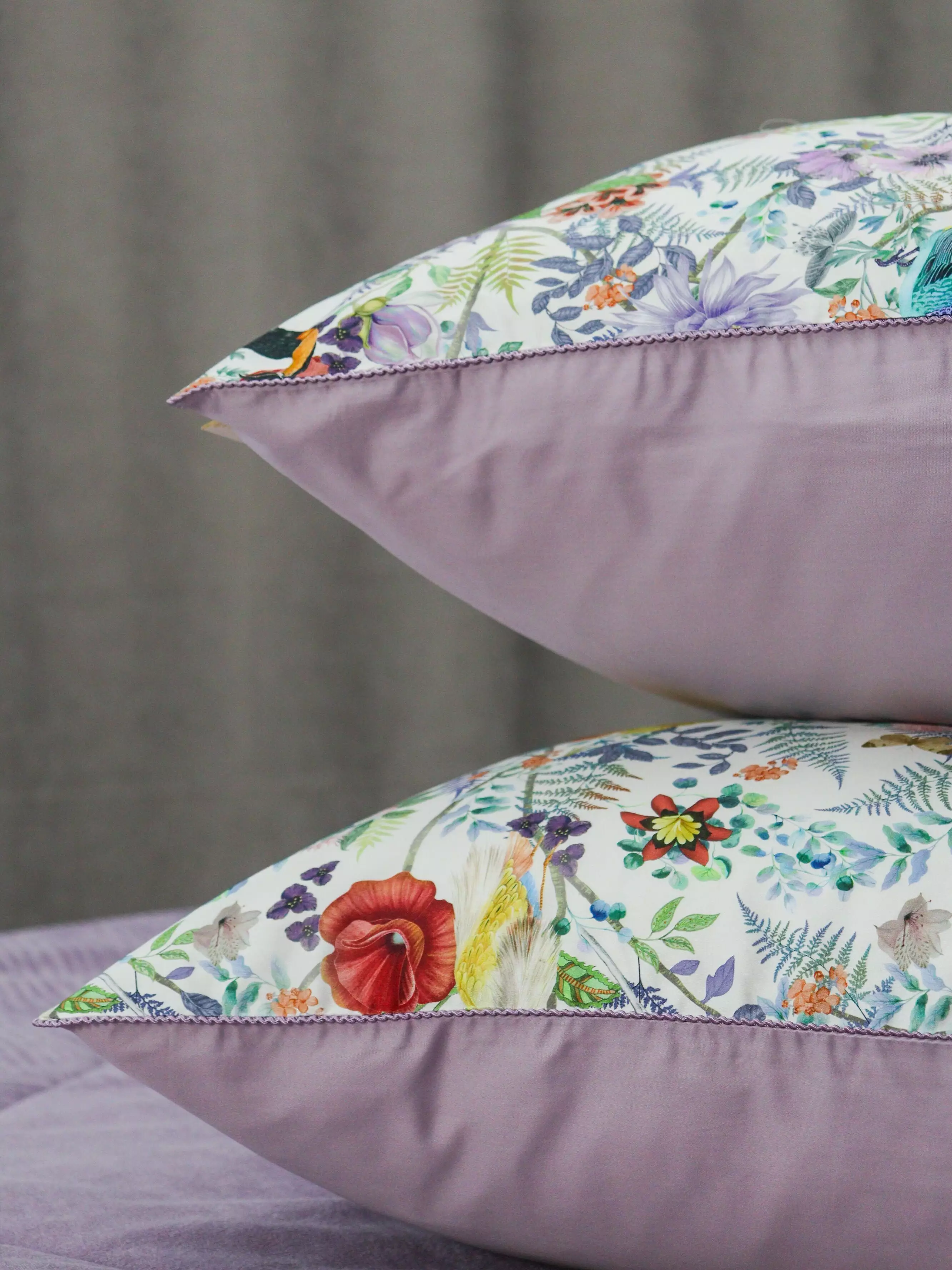 В комплекте 4 наволочки. Две наволочки размером 50х70 на молнии с изысканной окантовкой, одна сторона из цветного 100% египетского хлопка, другая сторона из однотонного. Другие две наволочки размером 70х70 на молнии с окантовкой, выполнены из комбинации нежного велюра и однотонного египетского хлопка. Такая комбинация позволяет быстро сменить общий стиль комплекта.