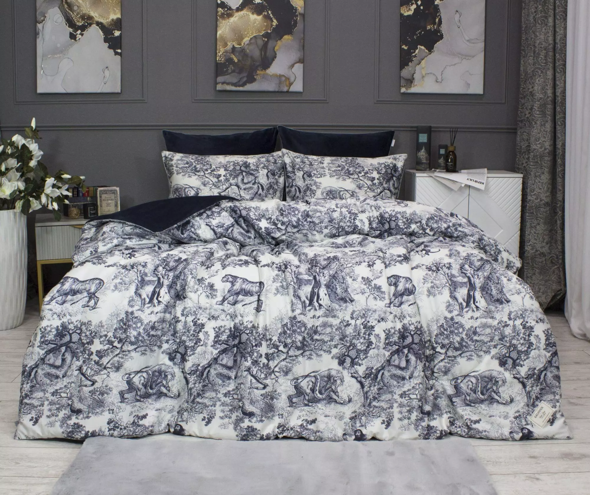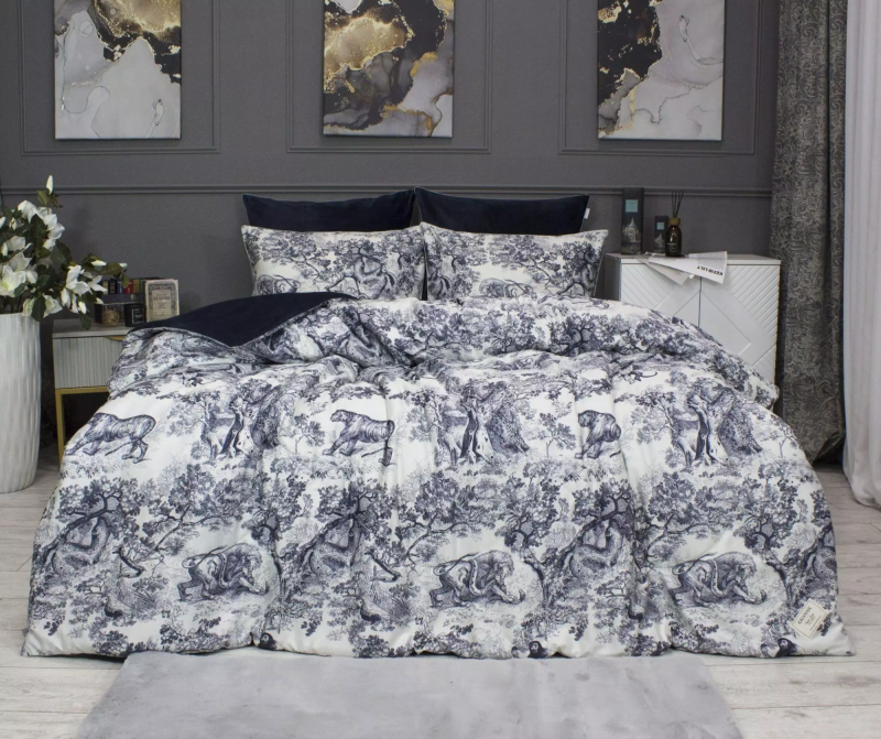 Особенность комплекта заключается в двустороннем одеяле, одна сторона выполнена из теплого мягкого, нежного велюра, а другая выполнена из нежнейшего 100% египетского хлопка, который отличается особой мягкостью и долговечностью. Главный плюс такого одеяло, что его можно использовать как покрывало. По краю изысканная золотая окантовка.