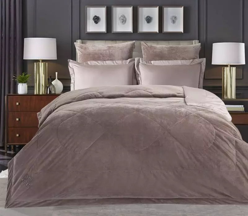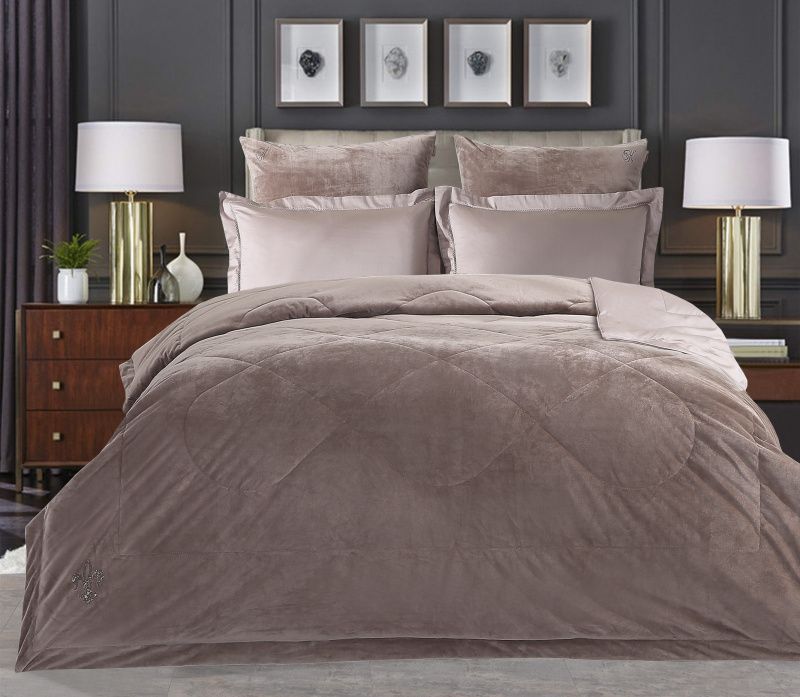 Особенность комплекта заключается в двустороннем одеяле, одна сторона выполнена из теплого, мягкого и нежного велюра, а другая выполнена из нежнейшего 100% египетского хлопка, который отличается особой мягкостью и долговечностью. Главный плюс такого одеяла, что его можно использовать как покрывало. Украшено фирменным гербом из качественных страз, нанесенными высокотемпературным способом. Одеяло имеет окантовку в виде простроченных ушек.