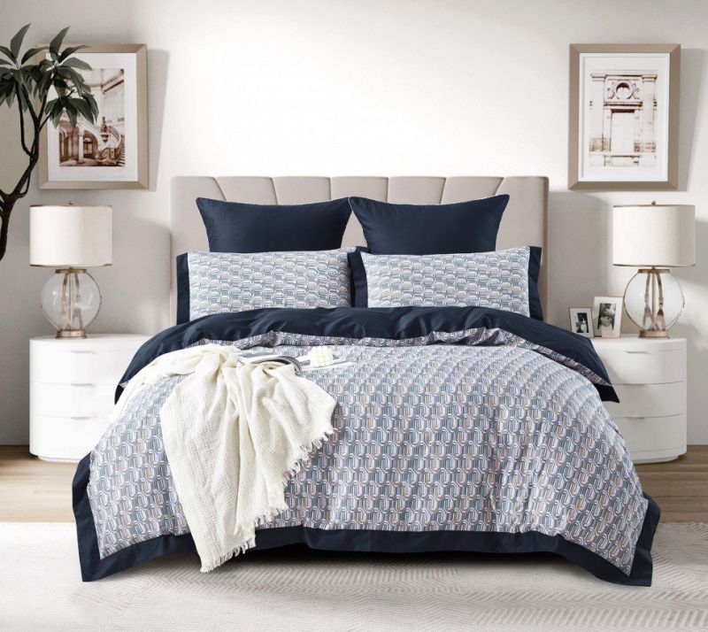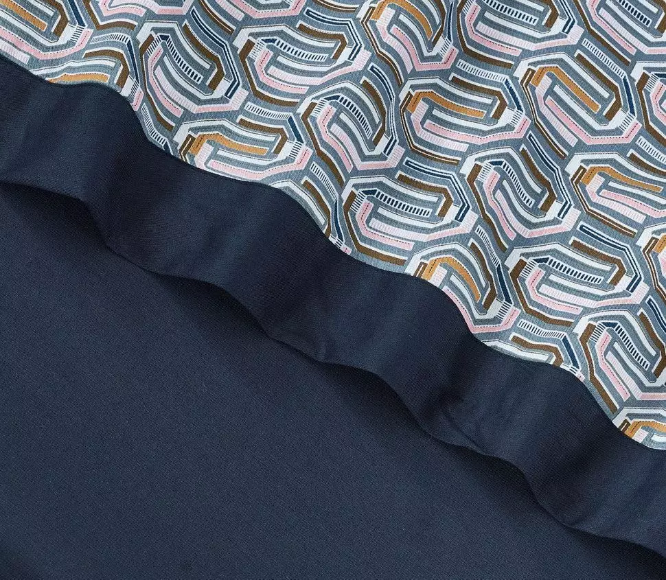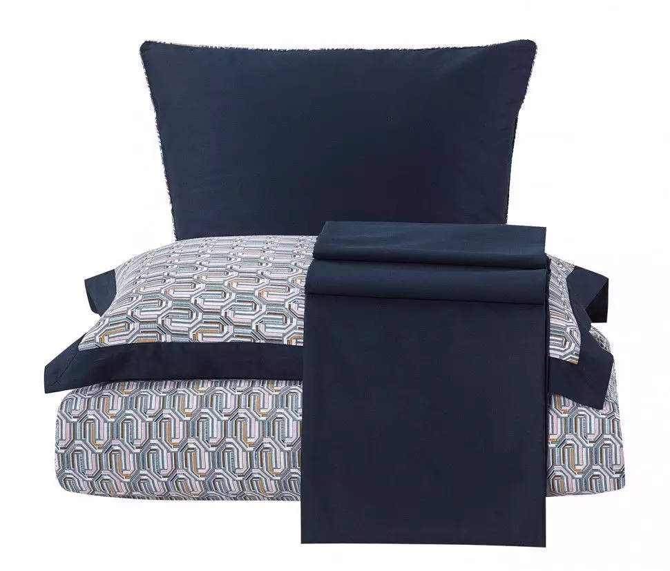 Пододеяльник со скрытой молнией и ушками. В наборе так же две однотонные наволочки 70х70 с окантовкой и две цветные наволочки 50х70 с ушками - на запах. В комплект входит простынь 240x260, которую мы предлагаем сделать на резинке под индивидуальные параметры вашего матраса с учётом высоты (стоимость рассчитывается исходя из размеров спального места).